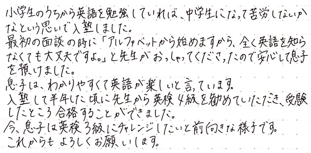 入塾から半年間、イチから英語を勉強して英語検定4級に合格しました。