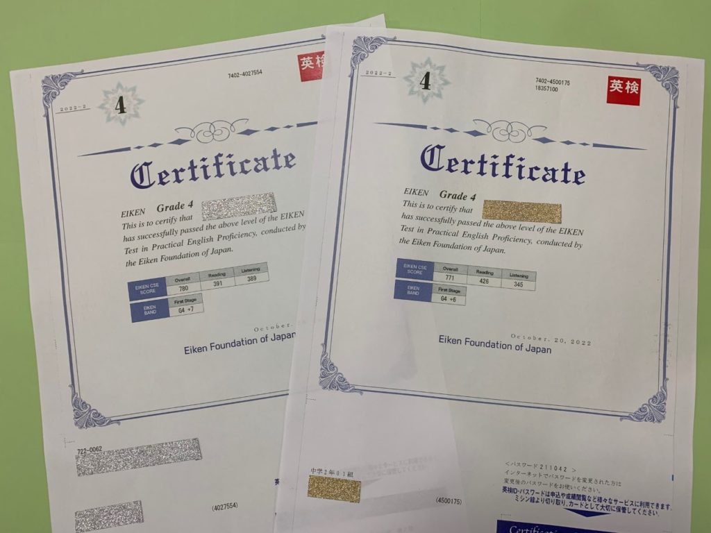 小学6年生と中学2年生の生徒が英検4級に合格しました!